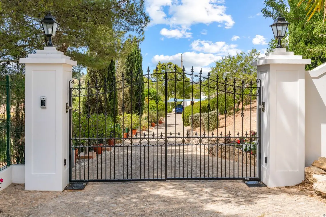 Tall wrought-iron entrance gates, electrically operated with video intercom access